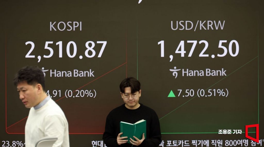 미 증시 및 금리인하 기대감이 줄면서 나스닥이 1.63% 하락 마감한 13일 코스피 지수는 전장보다 7.63포인트(0.30%) 내린 2508.15에, 원달러 환율은 8.2원 상승한 1,473.2원에 장을 시작했다. 이날 서울 중구 하나은행 딜링룸 직원들이 업무를 보고 있다.