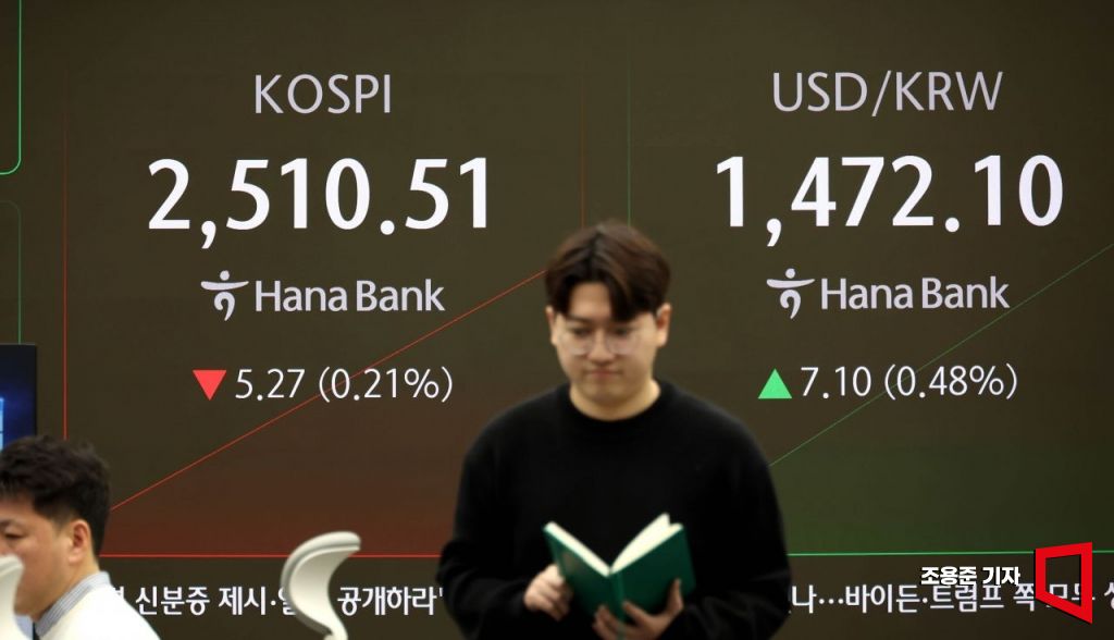 미 증시 및 금리인하 기대감이 줄면서 나스닥이 1.63% 하락 마감한 13일 코스피 지수는 전장보다 7.63포인트(0.30%) 내린 2508.15에, 원달러 환율은 8.2원 상승한 1,473.2원에 장을 시작했다. 이날 서울 중구 하나은행 딜링룸 직원들이 업무를 보고 있다.