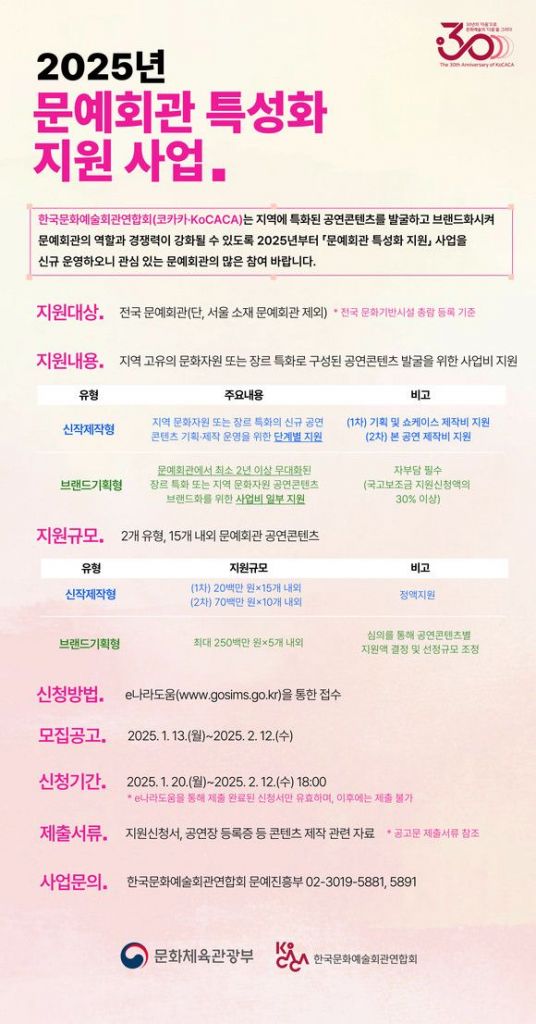 문화체육관광부가 주최하고 한국문화예술회관연합회(코카카)가 주관하는 '문예회관 특성화 지원 사업' 공모가 13일부터 2월 12일까지 진행된다.
