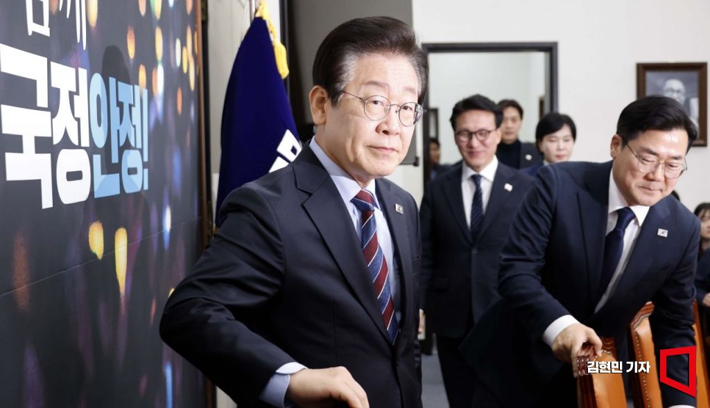 이재명 더불어민주당 대표가 13일 국회에서 열린 최고위원회의에 참석하고 있다.
