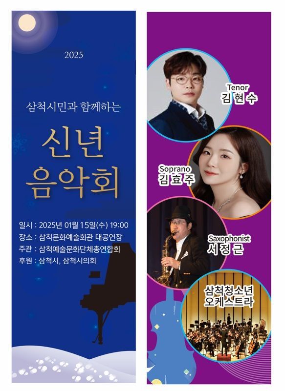 강원특별자치도 삼척시(시장 박상수)는 13일, 삼척시민과 함께하는 신년 음악회가 오는 15일 오후 7시에 삼척문화예술회관 대공연장에서 열린다고 밝혔다.