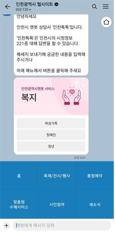 인천톡톡은 교통, 복지, 생활, 일자리 등 7개 분야의 민원을 처리하며, 총 221개 질문에 답변하는 인공지능 상담사다. 카카오톡 친구 목록 화면에서 '인천광역시 웹사이트'를 검색한 뒤 플러스 친구로 등록하면 곧바로 서비스를 이용할 수 있다.