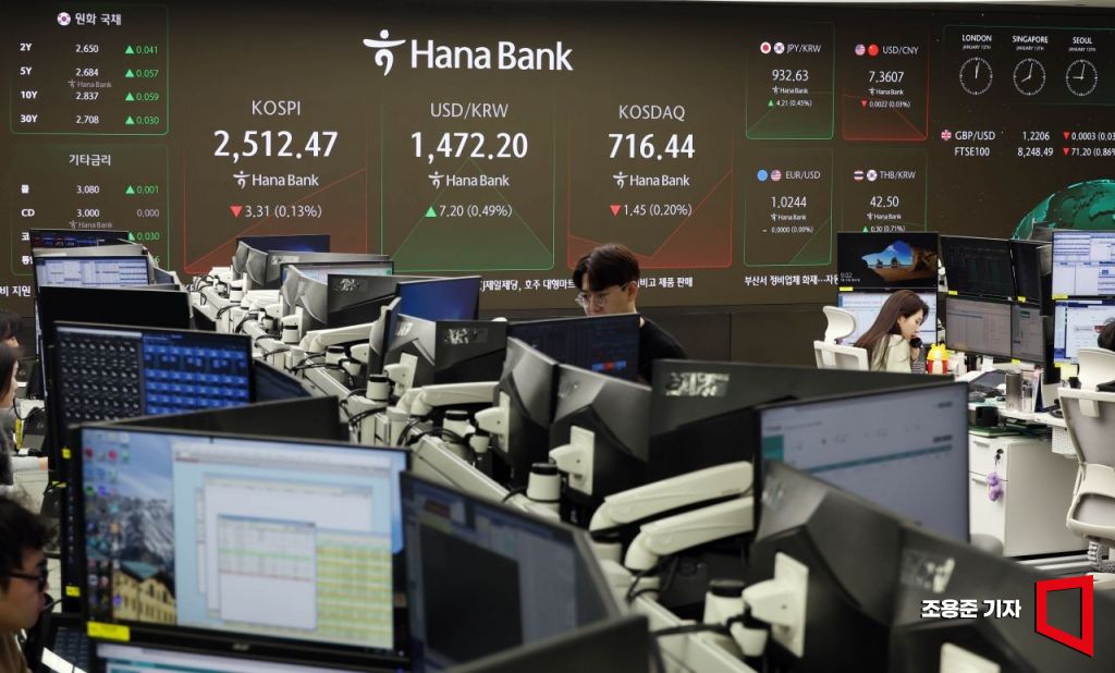 환율이 1470원을 돌파한 13일 서울 중구 하나은행 딜링룸 직원들이 업무를 보고 있다. 조용준 기자