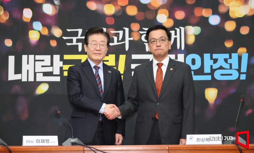 최상목 대통령 권한대행 부총리 겸 기획재정부 장관이 13일 서울 여의도 국회에서 더불어민주당 이재명 대표와 면담에 앞서 악수하고 있다. 국회사진기자단