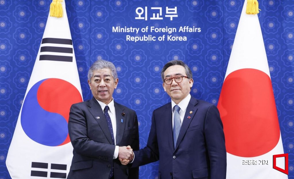 조태열(오른쪽) 외교부 장관과 이와야 다케시 일본 외무대신이 13일 서울 종로구 외교부에서 열린 한일외교장관회담에서 앞서 기념촬영을 하고 있다.