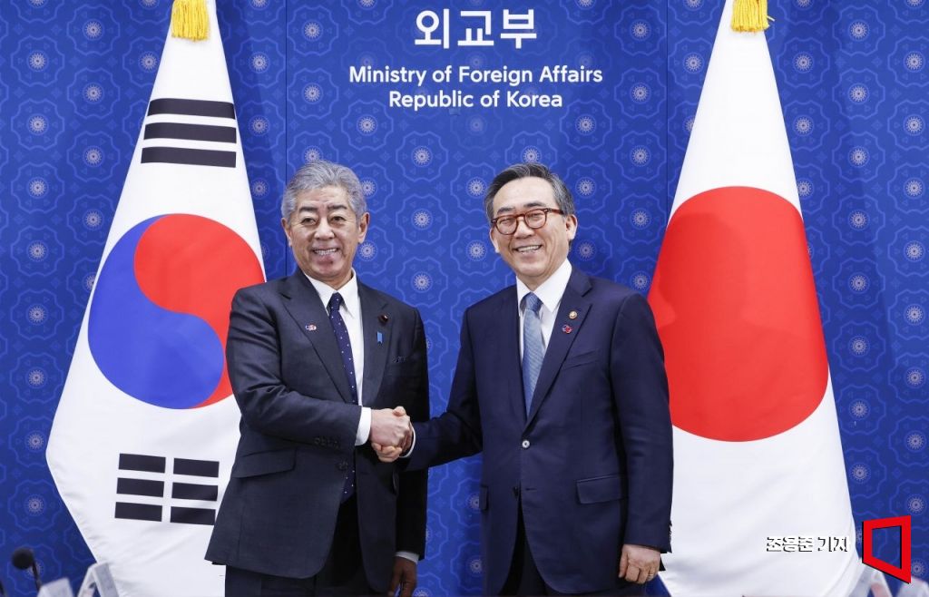 조태열(오른쪽) 외교부 장관과 이와야 다케시 일본 외무대신이 13일 서울 종로구 외교부에서 열린 한일외교장관회담에서 앞서 기념촬영을 하고 있다.