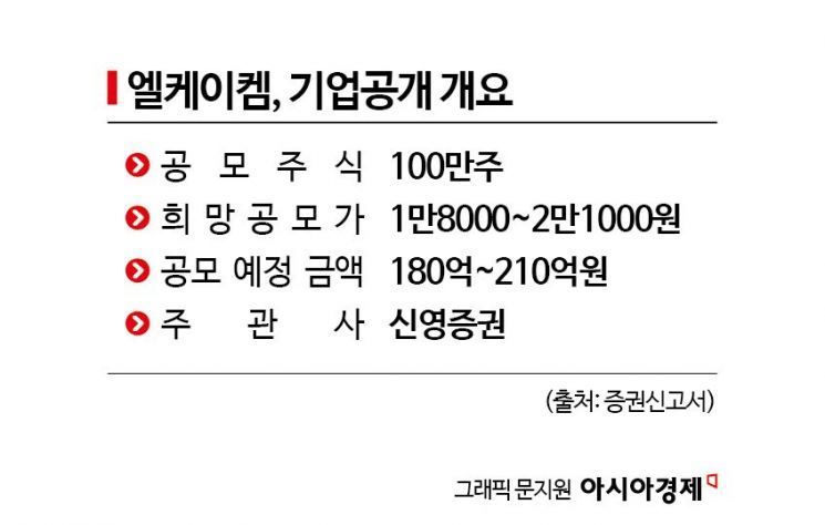 엘케이켐의 희망 공모가는 1만8000~2만1000원입니다. 주관사인 신영증권은 공모가를 산정할 때 주가수익비율(PER)을 활용했습니다. 비교기업으로는 디엔에프, 레이크머티리얼즈, 제이아이테크, 솔브레인 등입니다. 이들의 평균 PER은 23.42배입니다.