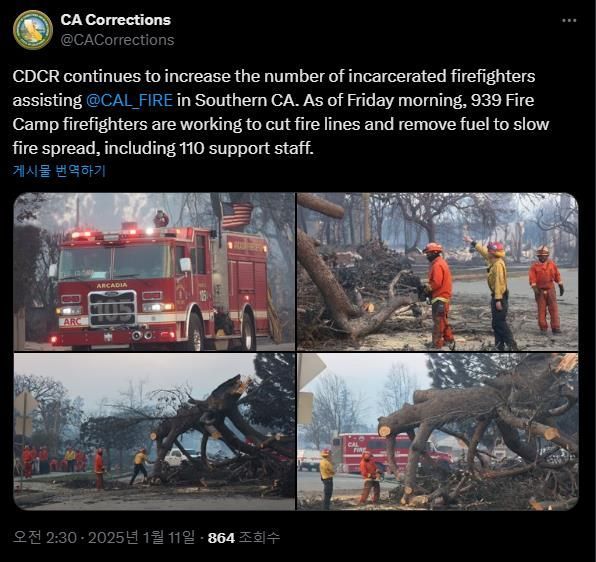 미국 캘리포니아주 교정갱생부는 최근사회관계망서비스(SNS) X(옛 트위터)를 통해 죄수 939명이 로스앤젤레스(LA) 일대 화재 진압 작업에 투입됐다고 발표했다. 미국 캘리포니아주 교정갱생부 X 캡처, 연합뉴스