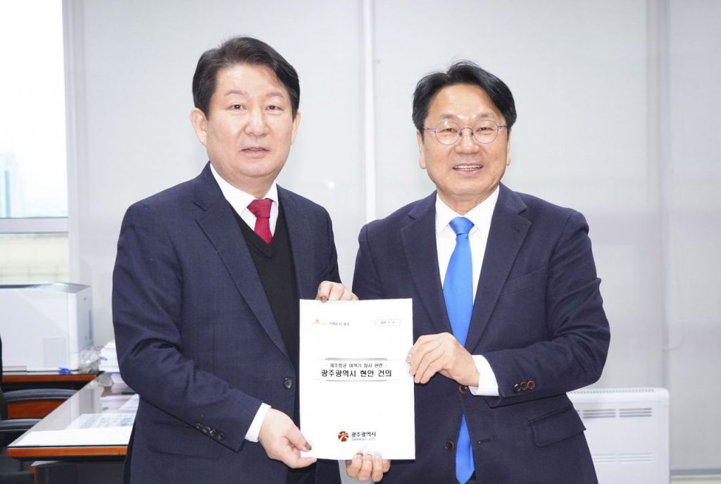강기정 광주시장이 13일 오전 서울 국회에서 권영진 국회 제주항공여객기참사특위 위원장을 만나 ‘제주항공 여객기 참사 피해지원 특별법’ 제정 관련 건의서를 전달하고 있다. 광주시 제공