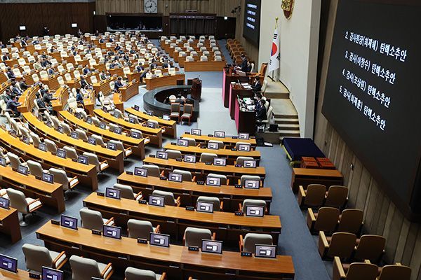 지난달 5일 국회 본회의에서 최재해 감사원장과 이창수 서울중앙지검장 등 검사 3명에 대한 탄핵 소추안이 야당 단독으로 통과되고 있다. 연합뉴스