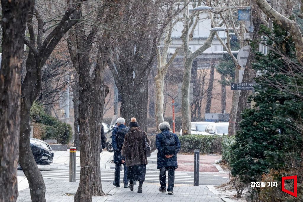 서울 지하철 5호선 마포역 인근에서 시민들이 눈을 맞으며 이동하고 있다. 사진=강진형 기자aymsdream@