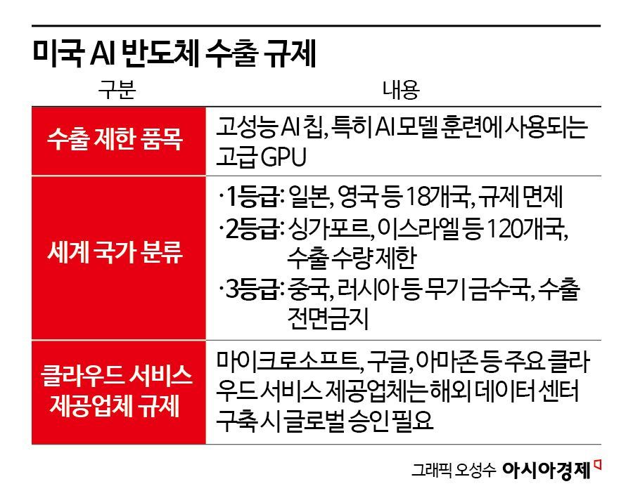 13일(현지시간) 미 정부가 발표한 AI 반도체 수출 규제는 전 세계 국가를 세 그룹으로 분류하고 있다. 이중 한국을 포함한 동맹국에는 무제한 수출을 허용한다. 중국·러시아·북한을 제외한 동남아, 중동 등은 향후 연간 약 5만개로 구매가 제한된다. 이번 조치는 중국의 영향력이 강한 동남아 국가들이 확보한 GPU가 중국을 위해 사용되거나 밀수출되는 것을 막으려는 의도가 자리 잡고 있다는 게 외교가의 시선이다. 동남아를 통해 중국으로 GPU가 밀수출될 수도 있기 때문이다. AWS, 마이크로소프트 등 주요 클라우드 사업자도 수출 제한 국가로의 GPU 도입에 제한이 생긴다.