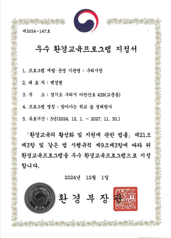 백경현 구리시장은 “2025년에도 생애주기에 맞는 다양한 환경교육프로그램을 개발하고 교육하며, 친환경적인 구리시가 되도록 적극 지원하겠다”고 밝혔다.