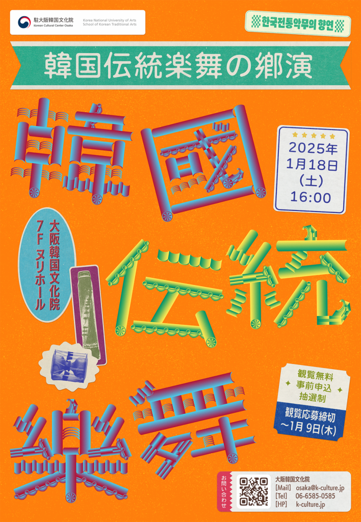 한국예술종합학교는 한일 국교 정상화 60주년을 맞아 18일 일본 오사카 한국문화원에서 '한국 전통 악무의 향연'을 공연한다. 전통예술원 소속 교수들이 궁중무용, 창작국악 등 무대를 펼친다. 전통음악, 무용, 창작 국악 등과 관련한 강연도 한다.