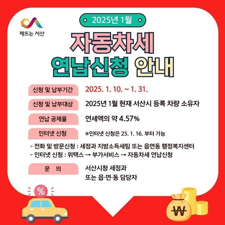 충남 서산시는 2025년 자동차세 연납 신청을 오는 31일까지 받는다고 14일 밝혔다.