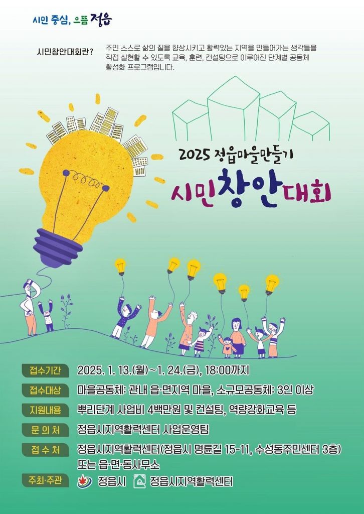 전북 정읍시가 주민 아이디어로 지역 경제와 문화를 활성화하는 ‘정읍형 마을만들기 시민창안대회(뿌리단계)’ 참가 공동체를 모집한다.