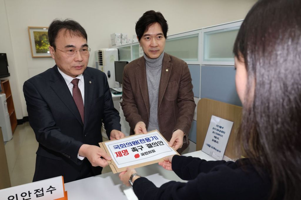 국민의힘 박성훈, 이종욱 의원이 14일 오전 서울 여의도 국회 의안과에서 더불어민주당 전용기 의원 제명촉구 결의안을 제출하고 있다. 연합뉴스