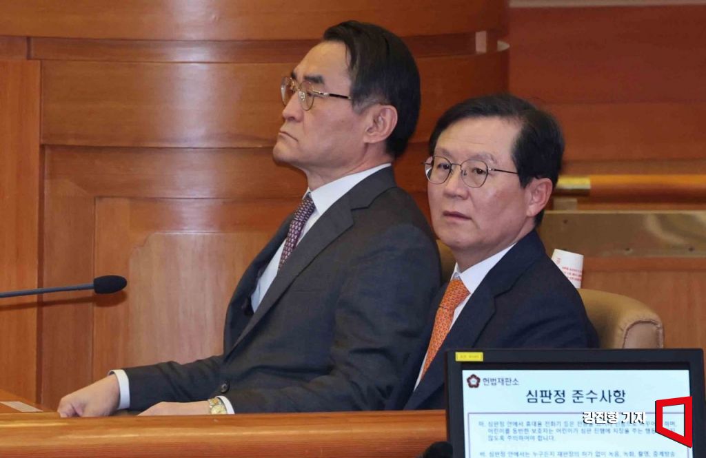 윤석열 대통령의 탄핵심판 첫 변론기일인 14일 오후 윤 대통령 측의 변호인인 윤갑근(오른쪽), 배보윤 변호사가 서울 종로구 헌법재판소 심판정에 착석해 있다.