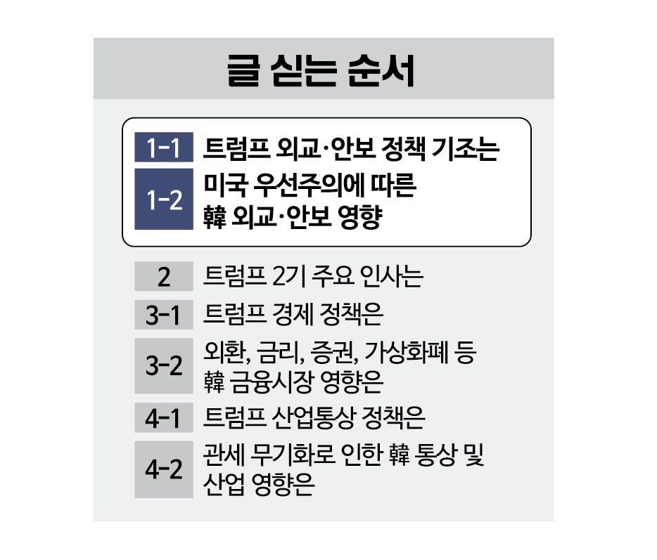 대외 의존도가 높은 한국 역시 소용돌이치는 국제 질서 속에서 트럼프 리스크에 고스란히 노출됐다. 당장 고율 관세, 방위비 분담금 증액 등의 압박이 예상되는 가운데, 비상계엄 사태에 따른 리더십 공백까지 덮치며 이러한 트럼프 리스크에 제대로 대비하지 못하고 있다는 지적이 계속된다. 아시아경제신문은 트럼프 당선인의 취임을 앞두고 총 4회에 걸쳐 2기 행정부의 외교안보·경제·산업통상 정책 기조와 이를 이끌 주요 인물, 한국에 미칠 여파를 짚어보고자 한다.
