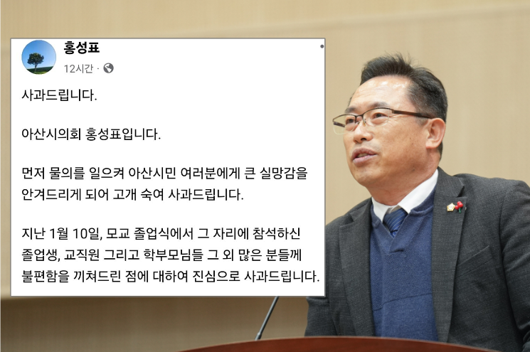 이와 관련해 그는 지난 13일 늦은 시간 자신의 SNS에 “많은 분께 불편함을 끼친 점을 진심으로 사과드린다”라면서 “부적절한 상태로 참석해 교직원과 학부모, 졸업생에게 심려를 끼쳤다”라고 사과문을 올렸다.
