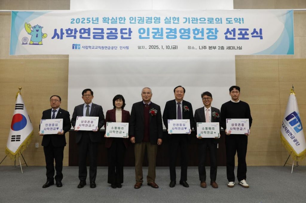 송하중 사학연금 이사장은 “인권은 현대 사회의 핵심 가치로, 사학연금이 국민들과 신뢰를 쌓아가기 위한 중요한 기반”이라며 “이번 선포식을 계기로 사람 중심의 인권 경영 문화를 통해 모든 업무 처리에서 임직원은 물론 이해관계자의 인권 존중을 최우선으로 하는 문화를 정착시켜 나가겠다”고 말했다.