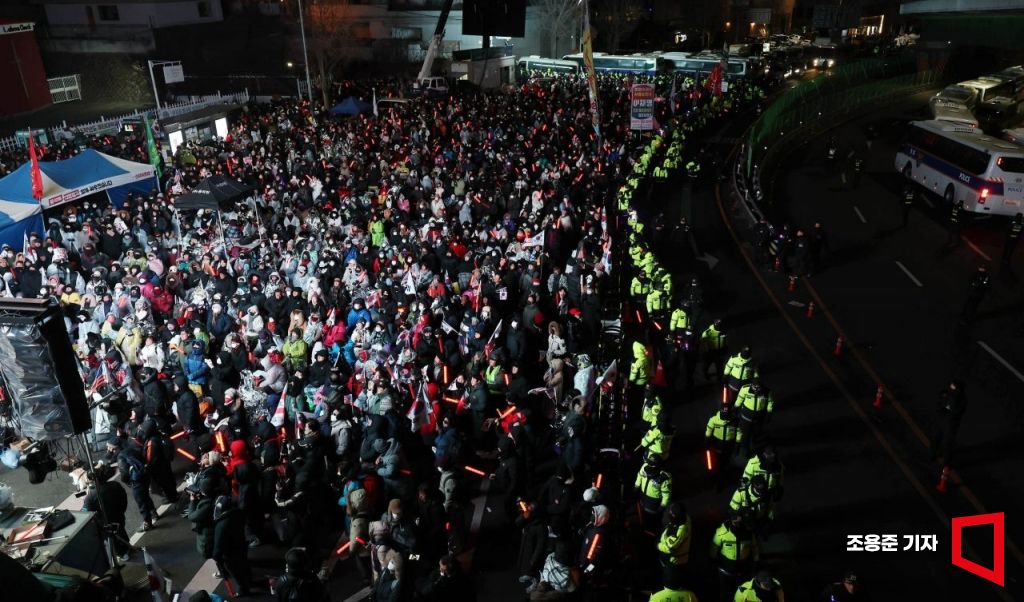 고위공직자범죄수사처(공수처)와 경찰이 윤석열 대통령에 대한 2차 체포영장 집행에 나선 15일 새벽 서울 용산구 한남동 대통령 관저 부근에서 지지자들이 밤샘 농성을 하고 있다.