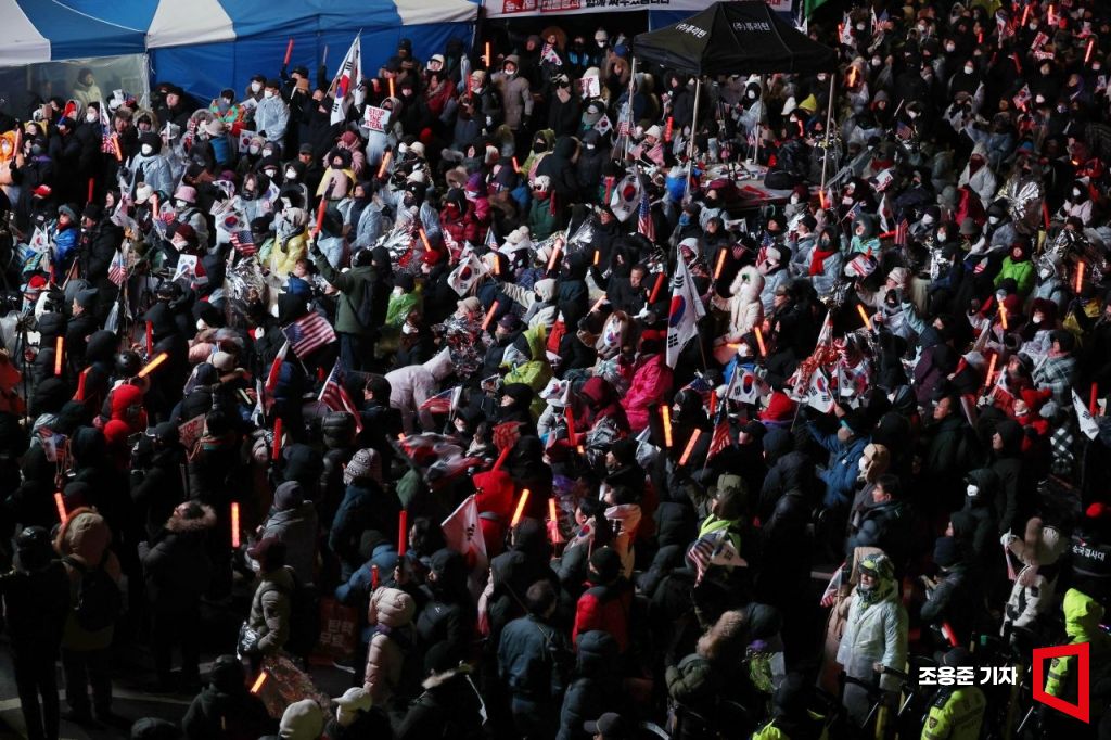 고위공직자범죄수사처(공수처)와 경찰이 윤석열 대통령에 대한 2차 체포영장 집행에 나선 15일 새벽 서울 용산구 한남동 대통령 관저 부근에서 지지자들이 밤샘 농성을 하고 있다.