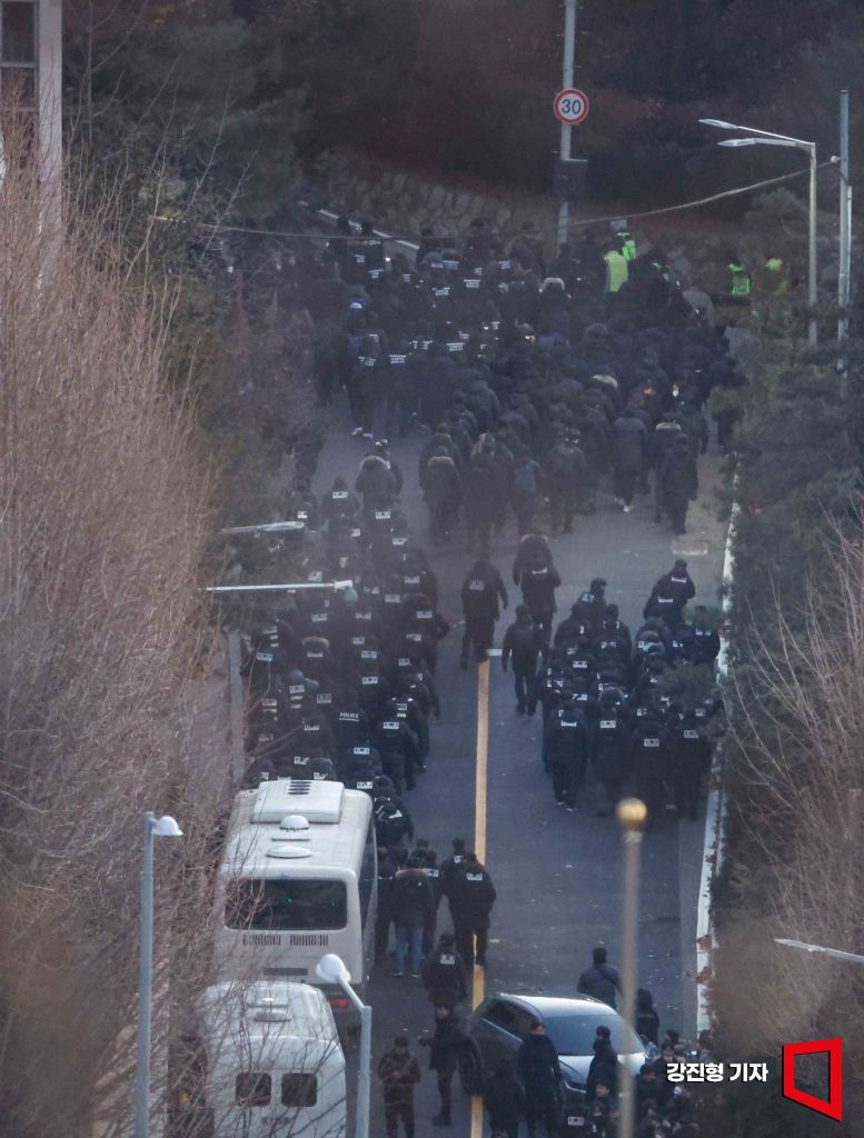 고위공직자범죄수사처와 경찰 비상계엄 특별수사단이 윤석열 대통령에 대한 체포영장 집행에 나선 15일 서울 용산구 대통령 관저에서 경찰이 정문을 통과하고 있다. 강진형 기자