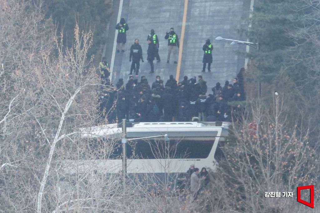 고위공직자범죄수사처와 경찰 비상계엄 특별수사단이 윤석열 대통령에 대한 체포영장 집행에 나선 15일 서울 용산구 대통령 관저에서 경찰이 2차 저지선을 통과하고 있다.