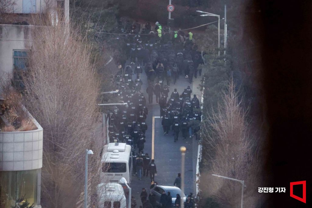 고위공직자범죄수사처와 경찰 비상계엄 특별수사단이 윤석열 대통령에 대한 체포영장 집행에 나선 15일 서울 용산구 대통령 관저에서 경찰이 정문을 통과하고 있다.
