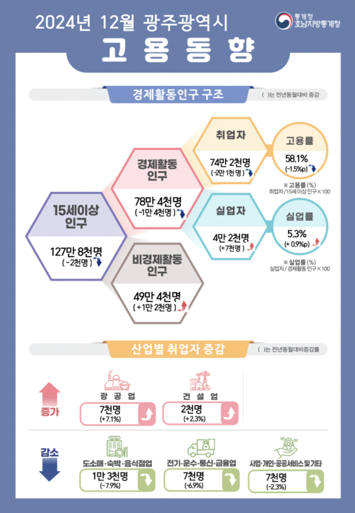 먼저 지난해 광주 취업자는 77만4000명으로 전년(76만9,000명) 대비 6,000명(0.7%) 증가했다. 경제활동인구는 79만9000명으로 1만명(1.3%) 증가했다.