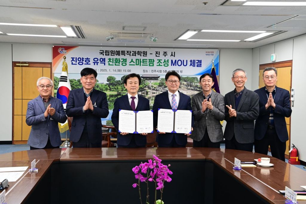 경남 진주시와 전북 완주시에 있는 농촌진흥청 산하 국립원예특작과학원(이하 ‘국립원예원’)은 지난 14일 진주시청 기업인의 방에서 ‘진양호 유역 친환경 스마트팜 조성’을 위한 업무협약을 체결했다.