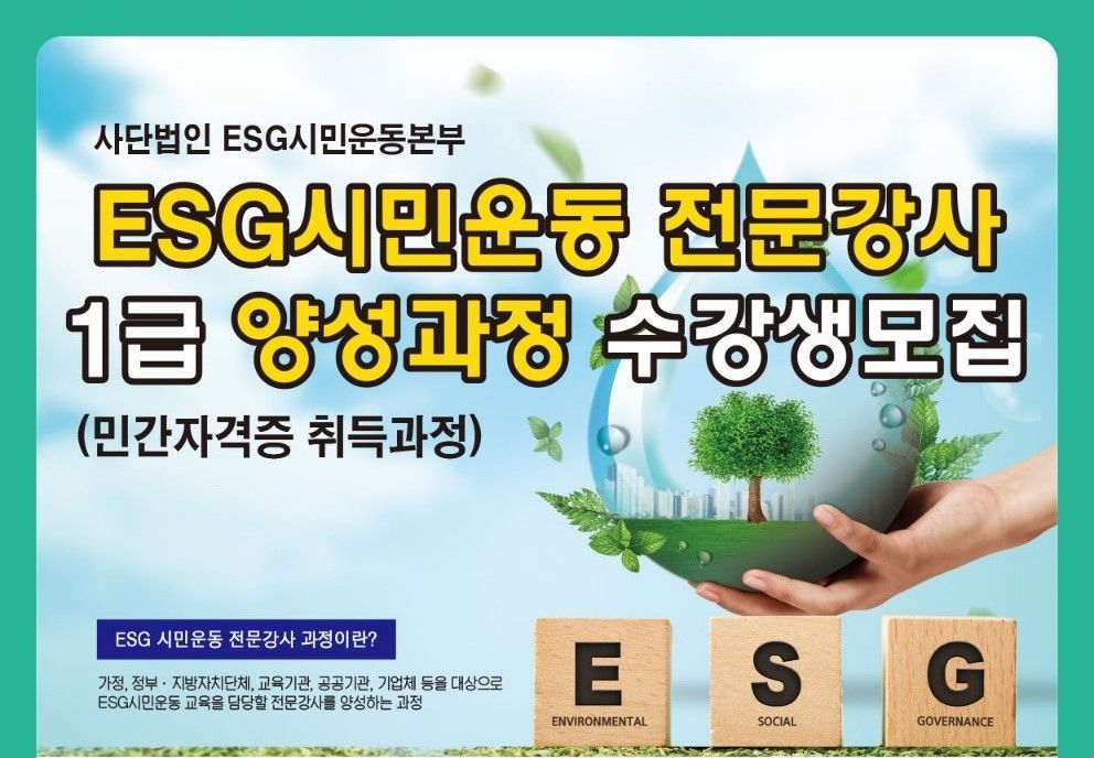 ESG시민운동 전문강사 자격증을 취득하면 전문강사로 위촉돼 지자체나 기관·단체, 기업 등 여러 곳에서 교육에 참여할 수 있다. 신청은 오는 31일까지 홈페이지나 전화로 하면 된다. 수강료와 교재비 등 32만원가량을 부담하면 된다.