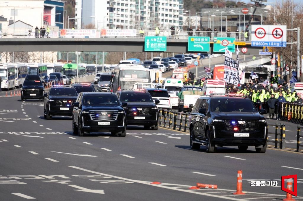윤석열 대통령이 탄 차량 행렬이 15일 서울 용산구 한남동 대통령 관저에서 과천 공수처로 향하고 있다.