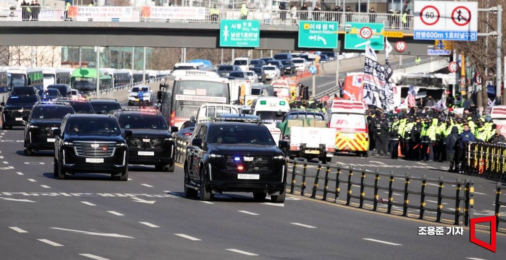 윤석열 대통령이 탄 차량 행렬이 15일 서울 용산구 한남동 대통령 관저에서 과천 공수처로 향하고 있다. 자
