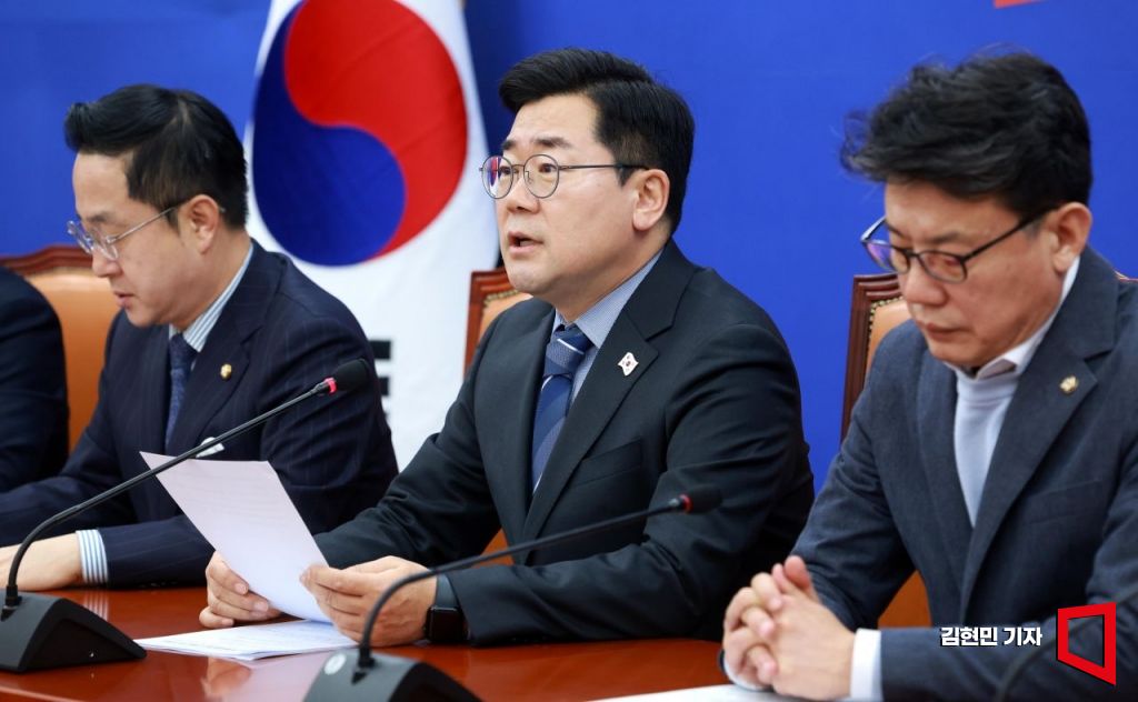 박찬대 더불어민주당 원내대표가 14일 국회에서 열린 원내대책회의에서 발언하고 있다. 김현민 기자
