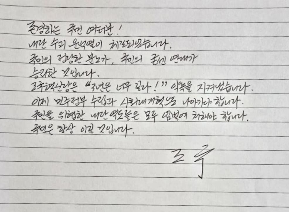 황현선 조국혁신당 사무총장은 15일 자신의 사회관계망서비스(SNS)를 통해 "조 전 대표가 윤석열이 체포되면 공개해달라고 편지와 메모를 남겼다"며 조 전 대표의 서신을 공개했다. 황 사무총장은 "지난 (조 전 대표의) 편지에서 '서울구치소에서 윤 대통령을 만나겠구나'했던 조 전 대표의 기대가 이뤄질 수 있겠다"며 "이제라도 서신을 공개할 수 있어서 다행이다. 숙제를 하나 끝낸 느낌"이라고 덧붙였다.