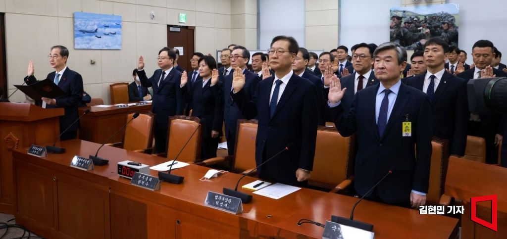 한덕수 국무총리가 15일 국회에서 열린 '윤석열 정부의 비상계엄 선포를 통한 내란혐의 진상규명 국정조사' 특별위원회에서 증인선서를 하고 있다.