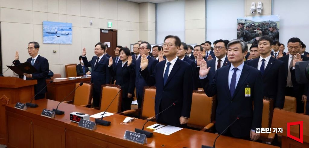 한덕수 국무총리가 15일 국회에서 열린 '윤석열 정부의 비상계엄 선포를 통한 내란혐의 진상규명 국정조사' 특별위원회에서 증인선서를 하고 있다.