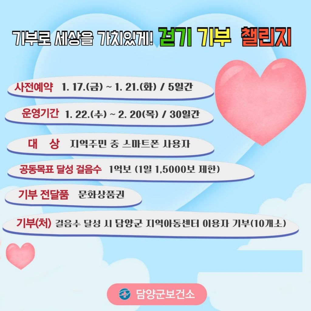 전남 담양군(군수 이병노)은 새해를 맞아 전 군민을 대상으로 ‘기부 걷기 챌린지’를 운영한다고 15일 밝혔다.