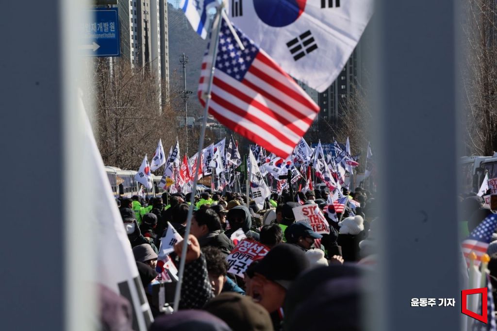 윤석열 대통령 2차 체포영장 집행이 진행된 15일 과천청사 공수처 청사 앞에 윤 대통령 지지자들이 구호를 외치고 있다.