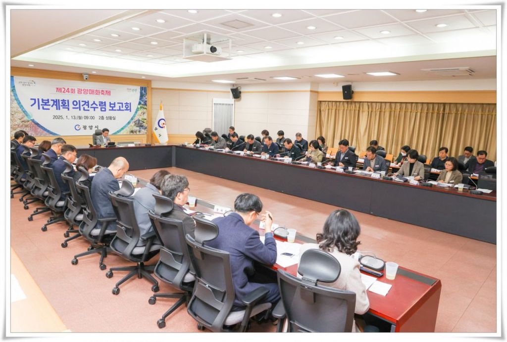 지난 13일 광양시청 상황실에서 정인화 광양시장을 비롯해 관계부서장 30여 명이 참석한 가운데 제24회 광양매화축제 기본계획(안) 의견수렴 보고회가 열렸다.
