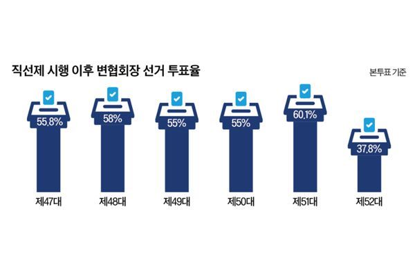 변협회장 선거에 직선제가 처음 도입된 2013년 제47대 선거 이후 열린 선거에서는 대부분 55~58%의 투표율을 보여왔다.
