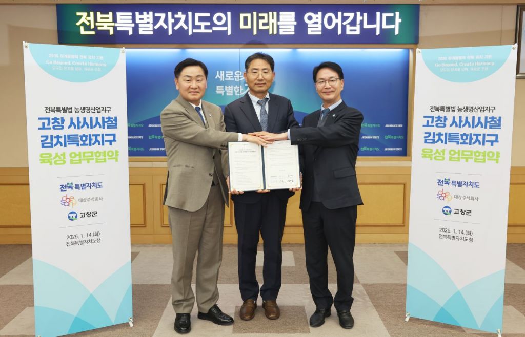 15일 군에 따르면 전날 전북특별자치도청 지사실에서 ‘3개 기관(고창군-전북도·대상) 고창 사시사철 김치특화산업지구 활성화를 위한 상생협력 업무협약식’이 열렸다.