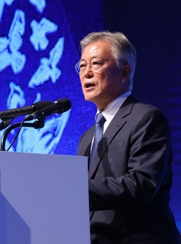 지난해 10월 4일 경기도 수원시 영통구 수원컨벤션센터에서 열린 '10·4 남북정상선언 17주년 기념식'에서 문재인 전 대통령이 기념사를 하고 있다. 연합뉴스