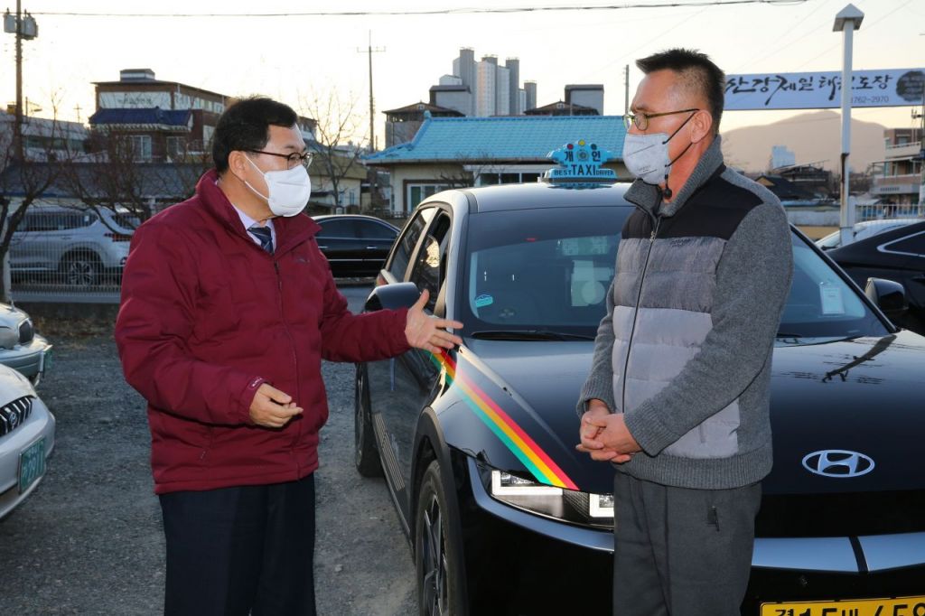 주낙영 경주시장(왼쪽)이 택시를 타고 무료택시 사업 현황을 둘러보고 있다. [사진=경주시]