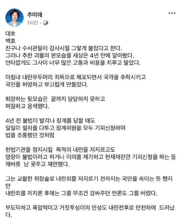 15일 추 의원은 자신의 사회관계망서비스(SNS)에 글을 올려 "대호, 백호. 친구나 수사관들이 검사 시절 (윤 대통령을) 그렇게 불렀다고 한다"고 운을 뗐다. 이어 "그러나 추한 괴물의 본모습을 세상은 4년 만에 알아봤다"며 "안타깝게도 그사이 너무 많은 고통과 비용을 치르고 말았다"고 썼다.