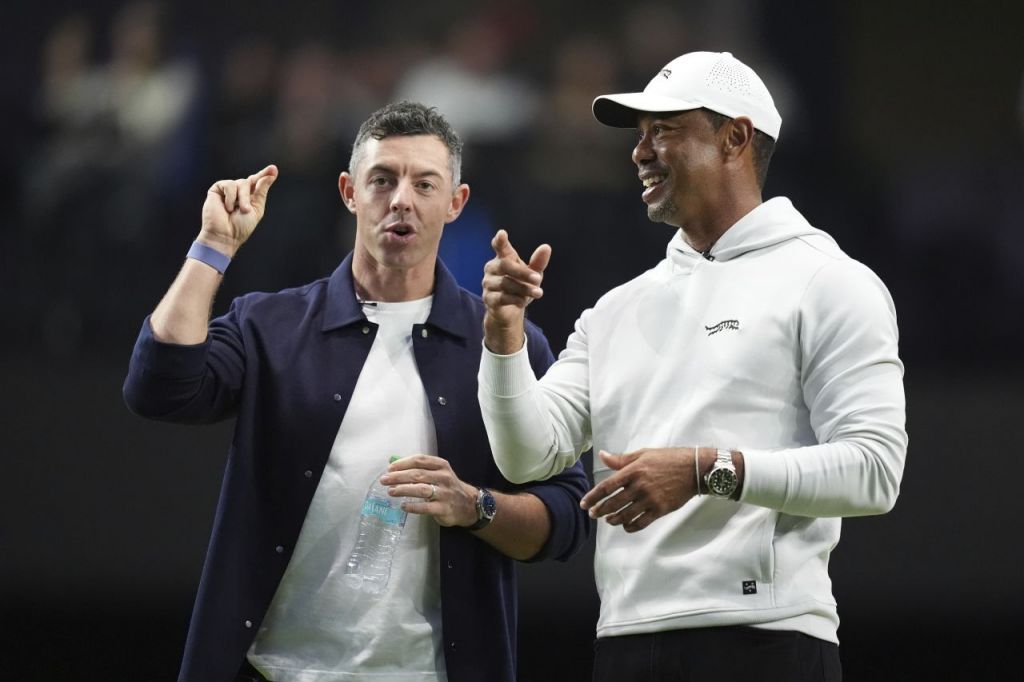 TGL은 타이거 우즈(오른쪽)와 로리 매킬로이가 주도한 스크린 골프 대회다. 두 선수가 TGR 개막전에서 환하게 웃으며 이야기를 하고 있다. 팜비치가든스=AP·연합뉴스