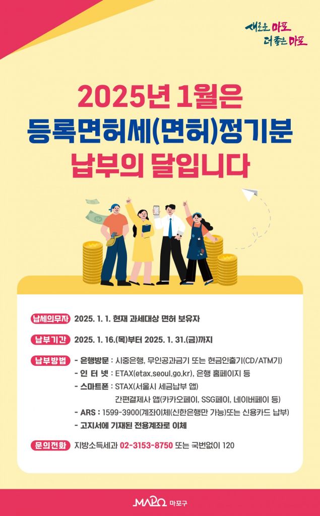 마포구(구청장 박강수)는 2025년도 1월 정기분 등록면허세(면허분)를 부과하고 구민들이 편리하게 납부할 수 있도록 적극적인 홍보에 나선다.