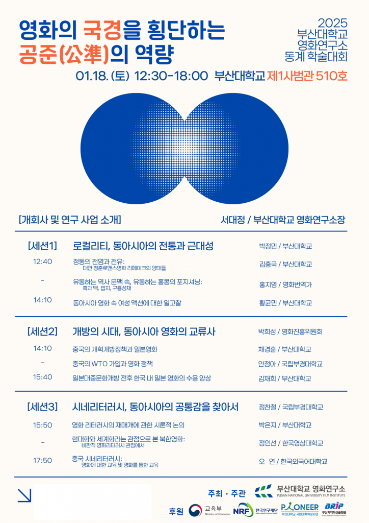 부산대학교(총장 최재원) 영화연구소(소장 서대정)는 ‘영화의 국경을 횡단하는 공준(公準)의 역량’을 주제로 2025년 부산대 영화연구소 동계 학술대회를 오는 18일 낮 12시 30분 교내 제1사범관에서 개최한다.